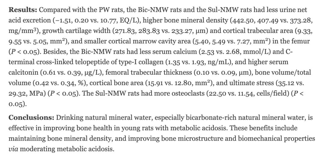 今年3月21日,国际SCI学术期刊《Frontiers in Nutrion》(营养学前沿)发表了陆军军医大学舒为群教授团队的最新研究论文“Drinking Natural Mineral Water Maintains Bone Health in Young Rats With Metabolic Acidosis(喝天然矿泉水有助于缓解幼鼠代谢性酸中毒并增强骨骼健康)” [8]。该项研究显示,饮用天然矿泉水,特别是天然富含碳酸氢盐的矿泉水可有效改善青年大鼠的骨骼健康。这些骨骼益处包括缓和代谢性酸中毒、维持骨矿物质密度、改善骨微观结构以及增强骨生物力学性能。