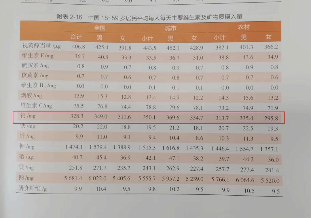 其中,18~59岁居民,每人每天实际钙摄入量为328.3mg;而18~50岁人群,建议摄入量为800mg,50~65岁的建议摄入量,则需要达到1000mg。
