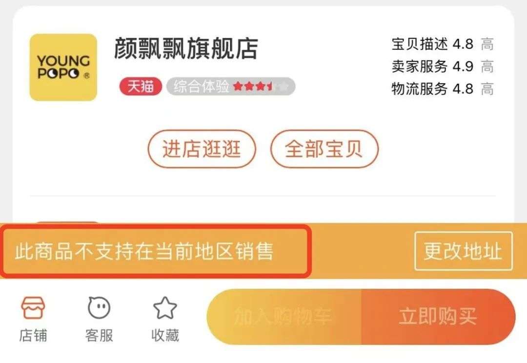 不过,5月17日直播时还能正常下单的“我的天呐旗舰店”“颜飘飘”却显示已无法下单,页面显示“此商品不支持在当前地区销售”。