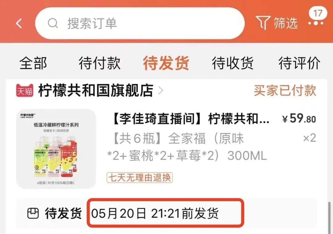 一一的朋友们买得更多,除了烧麦,还购买了砂锅土豆粉、柠檬汁饮料、鸭舌等商品。根据一一提供的截图,发货时间最快的柠檬汁显示在5月20日21点前发货,仅需3天时间。尽管商家发货时间还没能恢复到封控前,但一一和朋友们都表示“体会到了淘宝购物的快乐”。