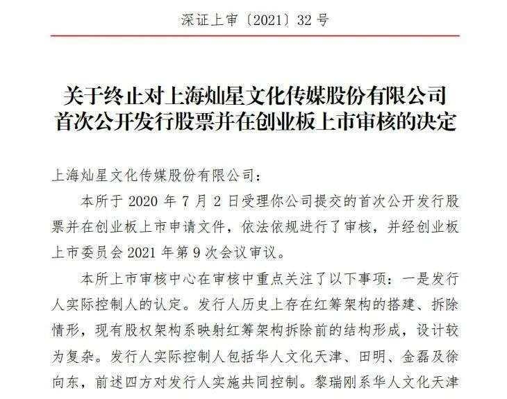 2021年2月冲击创业板失败后,深交所上市委给出的意见为:一是公司股权架构设计复杂,认定实际控制人的理由不充分、披露不完整;二是2016年灿星文化收购梦响强音,形成商誉金额为19.68亿元,2016年计提减值损失3.47亿元,上述会计处理未能准确反映发行人当时的实际情况。