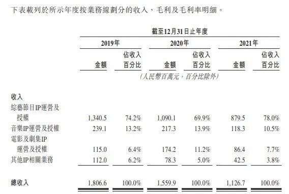 数据显示,2019年~2021年,综艺节目IP运营及授权贡献了约七成营收,但具体营收分别为13.41亿元、10.09亿元、8.80亿元,呈现逐渐下降趋势。
