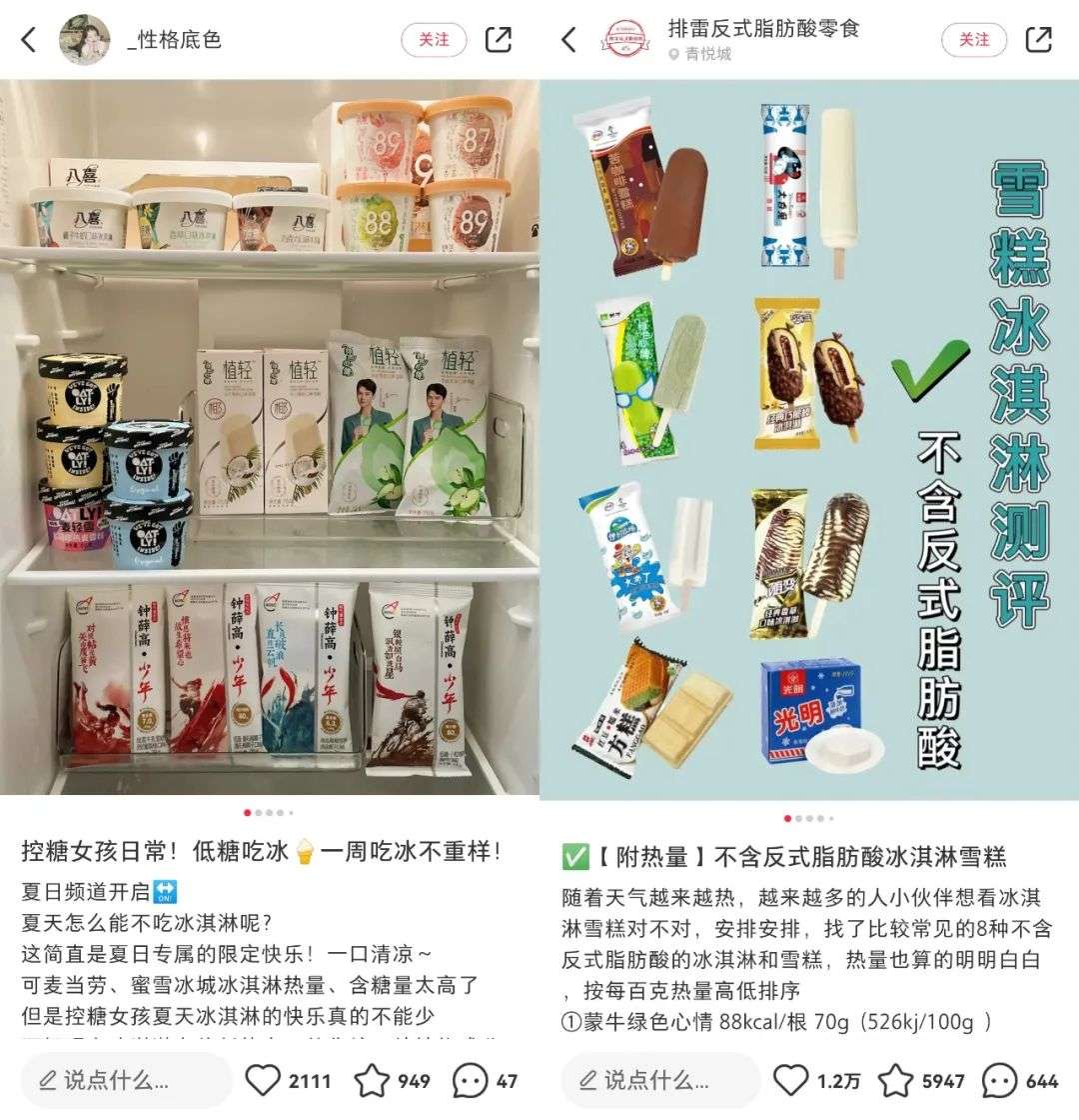 近两年食品饮料的减糖、低脂趋势依然有增无减,注重健康的消费者们除了“谈糖色变”,对食物热量、营养要素构成也更加严格选择。小红书平台中,不少冰淇淋/雪糕测评以低卡、控糖、不含反式脂肪酸为主题,还用指标给各种产品进行高低排序,一目了然。