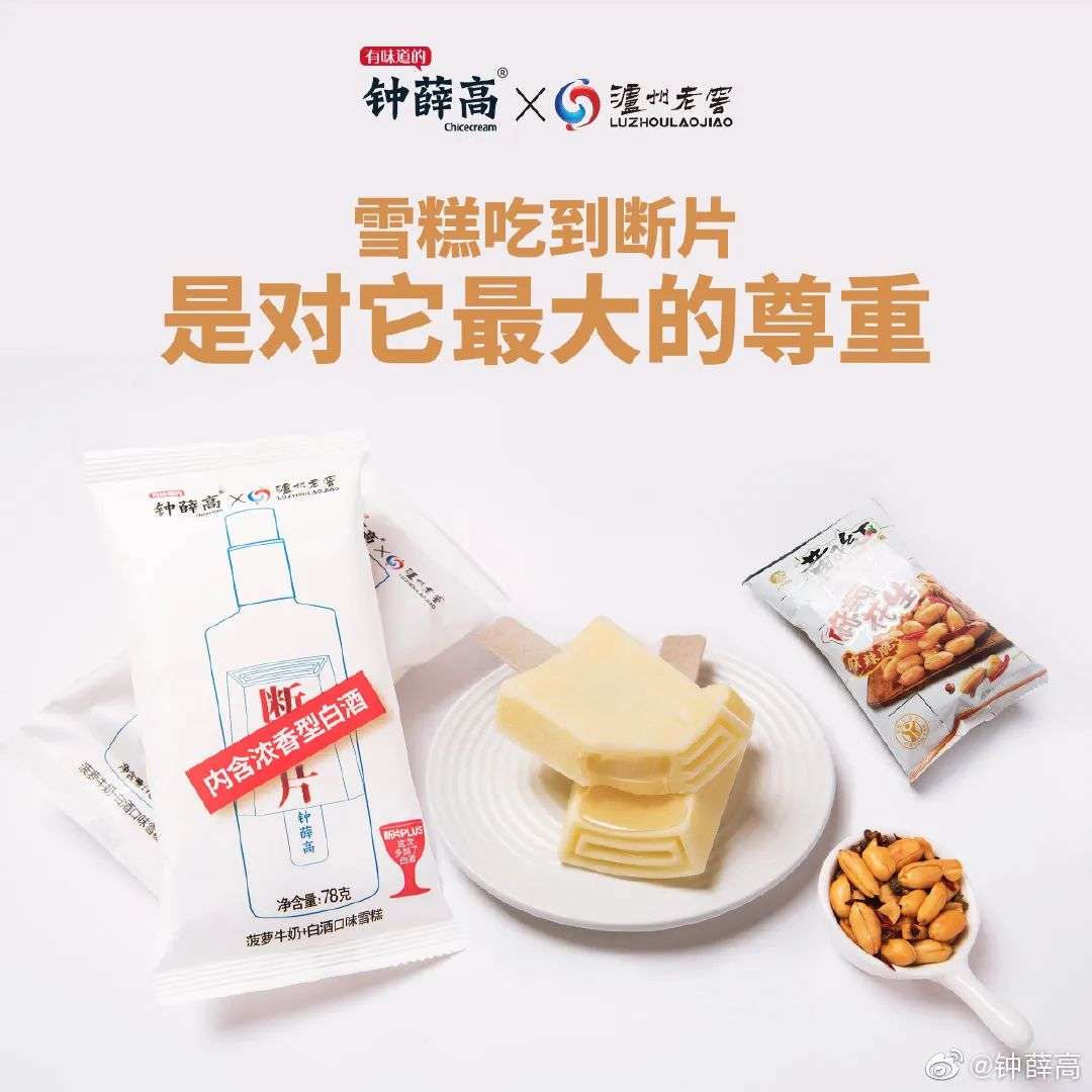 早在2019年,钟薛高就与泸州老窖联名,首次推出“断片”系列,雪糕以浓香型白酒为芯,通过特殊技术注入并保持流心口感,外层则用牛乳搭配菲律宾MD2金菠萝树熟果。