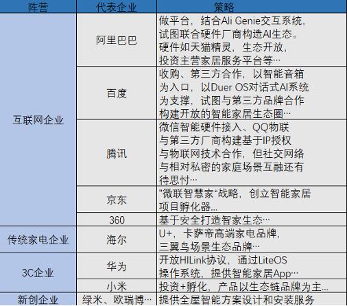从单品智能步入智能互联,各个阵营代表玩家的策略如下: