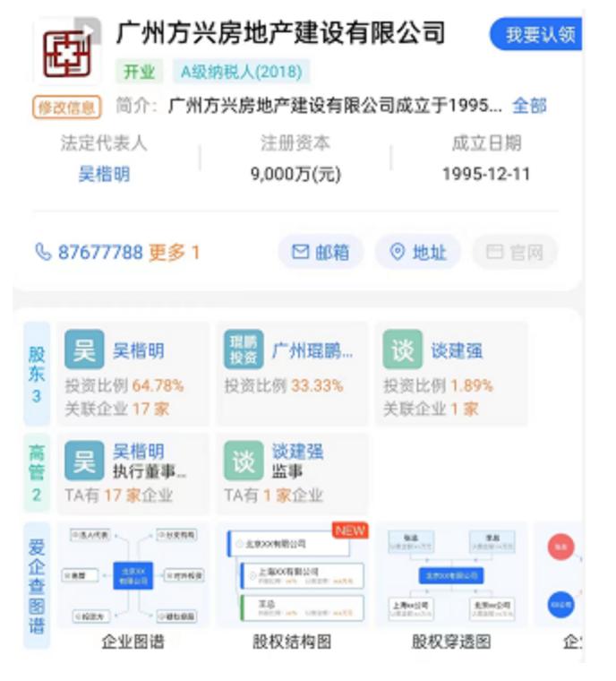 启信宝数据显示,广州方兴房地产建设有限公司成立于1995年,吴楷明为实际控制人。