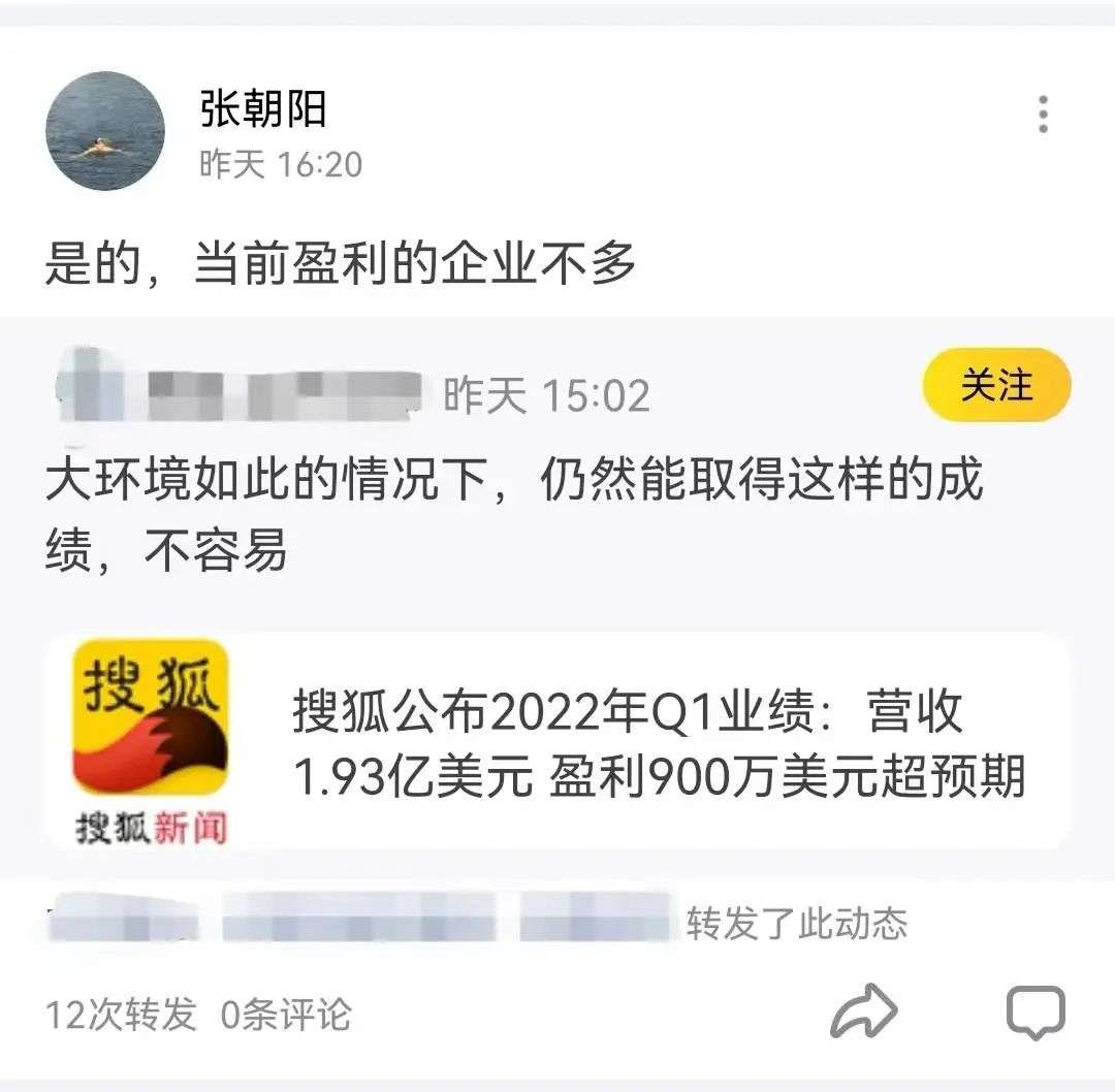张朝阳的活跃,也不仅仅在搜狐号上。一季度的财报出来后,搜狐旗下狐友APP上有网友评论,“大环境如此的情况下,仍然能取得这样的成绩不容易”。张朝阳转发称,“是的,当前盈利的企业不多”,尽管搜狐没有回到舞台中央,但或许张朝阳对当前状态是满意的。