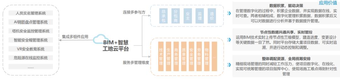 《报告》:以“组件+云平台”为业务形态的 “BIM+智慧工地”数字化解决方案,满足新时代下的施工管理诉求。其中,“BIM+智慧工地”云平台是解决方案的核心,以BIM和物联网为技术基础,统一集成施工现场的碎片化应用/组件,并累积施工业务中产生的业务数据,形成数据中心。通过建立统一的主数据、入口、技术标准和数据接口,实现组件模块之间的协同与数据共享。同时基于平台内的数据中心,服务于多方的科学决策,为工地的精细化、智能化管理提供数据支撑。