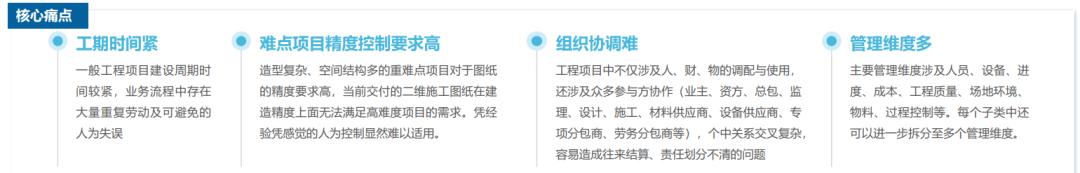 相比设计规划阶段,处于建筑施工阶段的项目,由于涉及专业工种多、工作环境复杂,工期长,且整体标准化程度较低,因此管理难度极大。