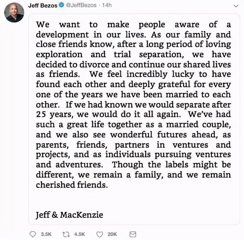 2019年1月,贝佐斯的一条推文引起各界聚焦,其突然在社交平台宣布将和25年的妻子离婚。