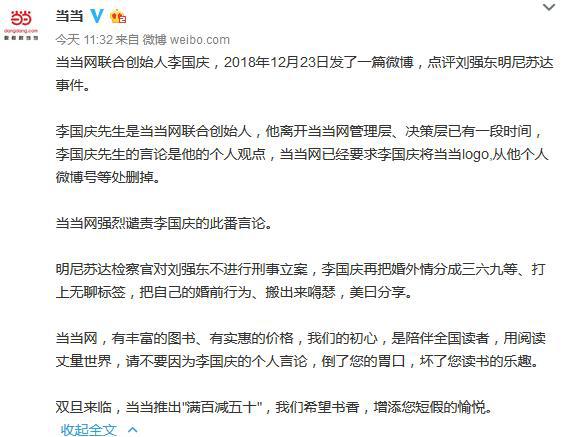 另一面,当当网官微下场,表示强烈谴责李国庆此番言论,“把婚外情分成三六九等,打上无聊标签,把自己的婚前行为搬出来得瑟,美曰分享”,并表示李国庆已经离开当当管理层、决策层有一段时间了,要求李国庆将当当Logo从他个人微博头像上删除。