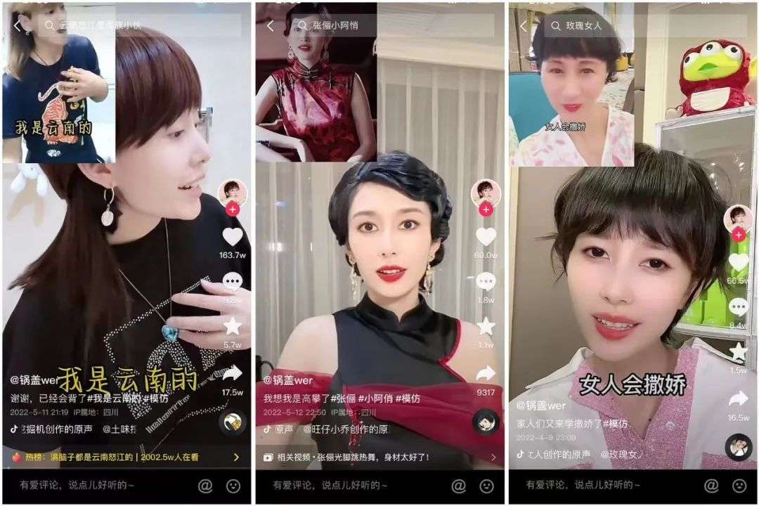 不过最近她先后发布了多支模仿视频,对象包括海清、潘周聃、张俪、@玫瑰女人 等人,视频的点赞数据从几十万到几百万不等,属于账号内第一梯队的视频,成功将@锅盖wer 重新带入大众视野。