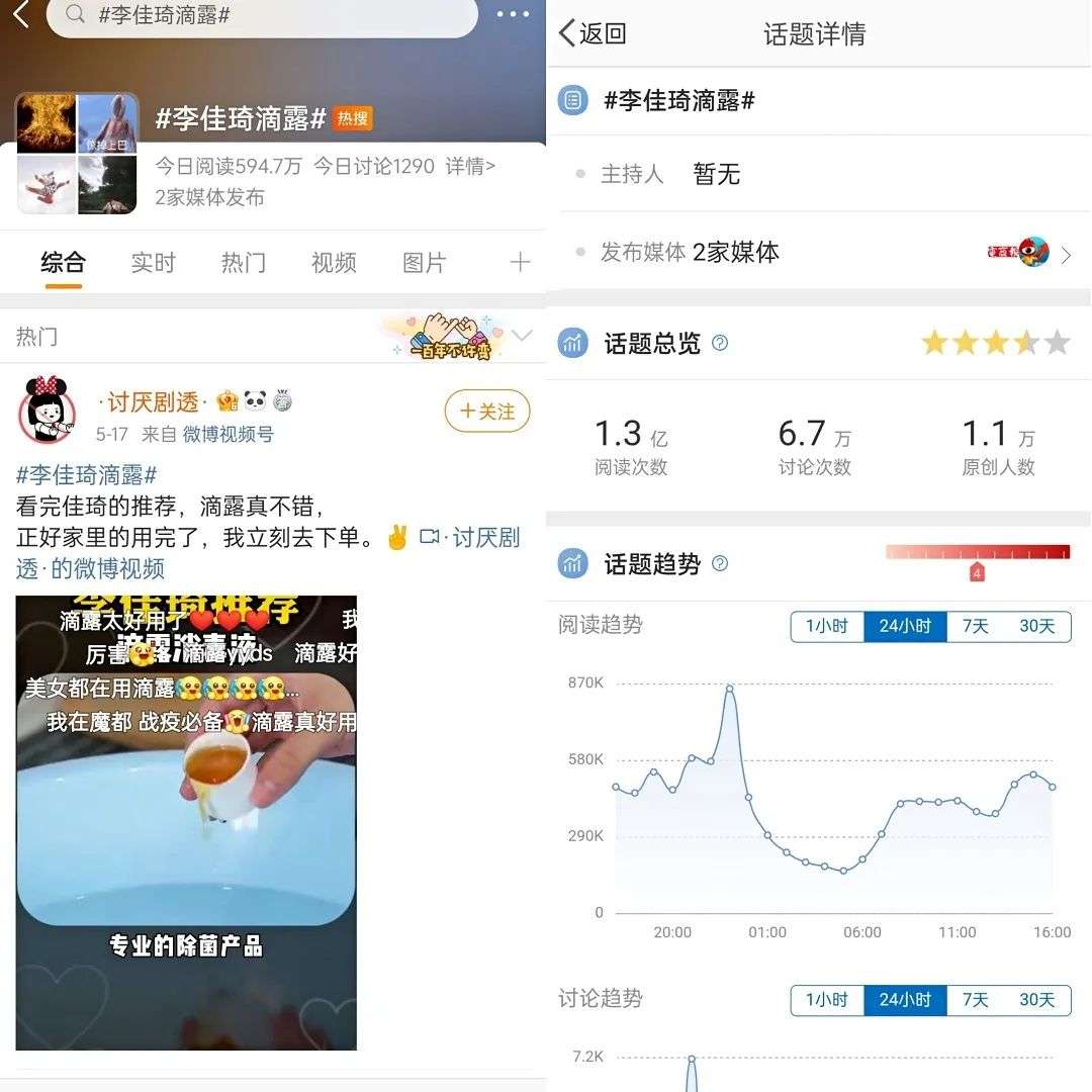 这些言论经微博账号@偶像日报社截屏发布后不久,#李佳琦滴露#接连两天登上微博热搜,引发众多网友热议。截至发稿前,该话题阅读量达1.3亿,讨论次数达6.6万。