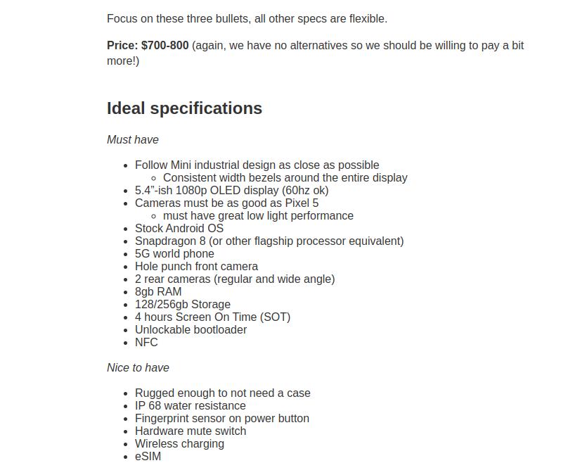 像广大数码爱好者一样,他列出了自己心仪的小屏旗舰愿望单:5.4 英寸左右的 1080P OLED 显示屏、Pixel 5 级别的相机表现、原生的安卓系统、骁龙 8 级别的旗舰处理器平台、支持 5G......