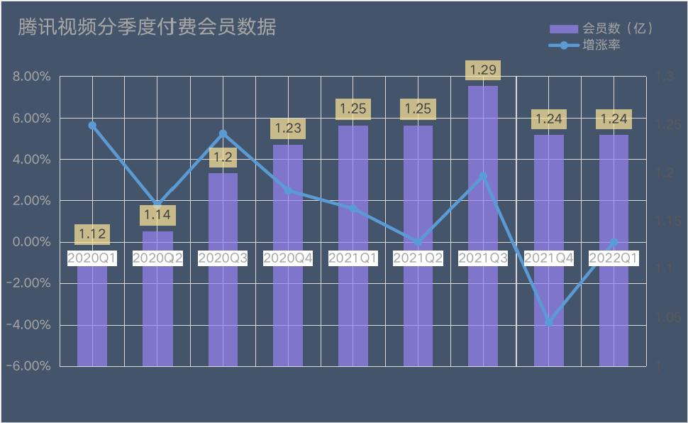 这是腾讯2022年Q1 财报中关于腾讯会员的最新数据,这意味着腾讯视频的会员数量环比没有变化,仍等于2021年第四季度的1.24亿。