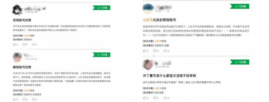 在黑猫投诉上,搜索“小红书”上,涉及封禁账号的投诉屡见不鲜。