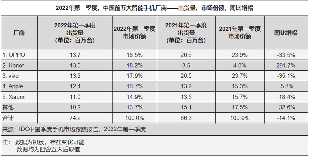 据IDC数据,Q1中国市场智能手机出货量约7420万台,同比下降14.1%。其中小米出货量约为1100万台,同比下降18.4%,以14.9%市场份额位列第五。