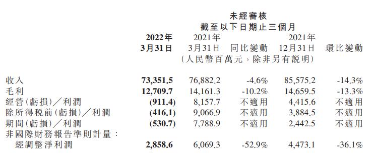 Q1营收为733.52亿元(人民币,下同),同比下降4.6%;其中,手机业务收入458亿元,同比下滑11.1%。