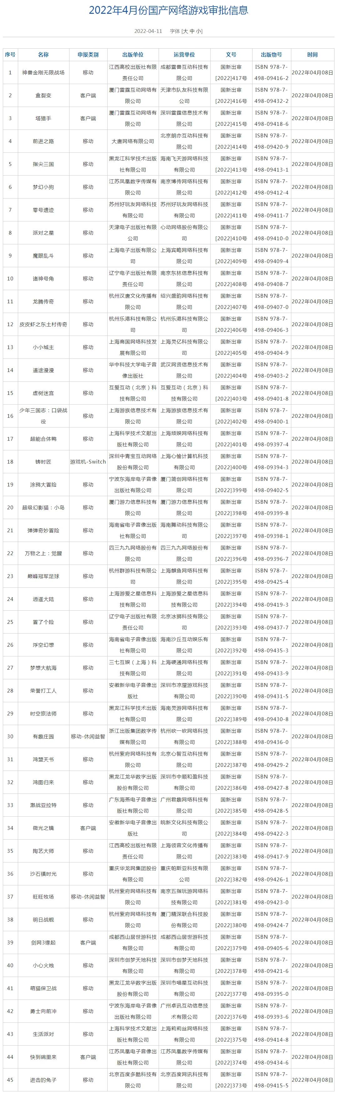 2022 年 4 月第一批游戏版号发布名单