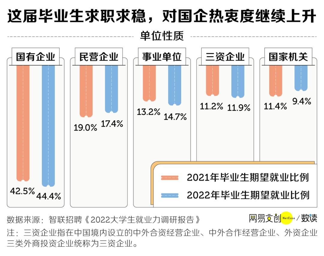 另外,2022 届毕业生期望到事业单位就业的比例也上涨了 1.5%。
