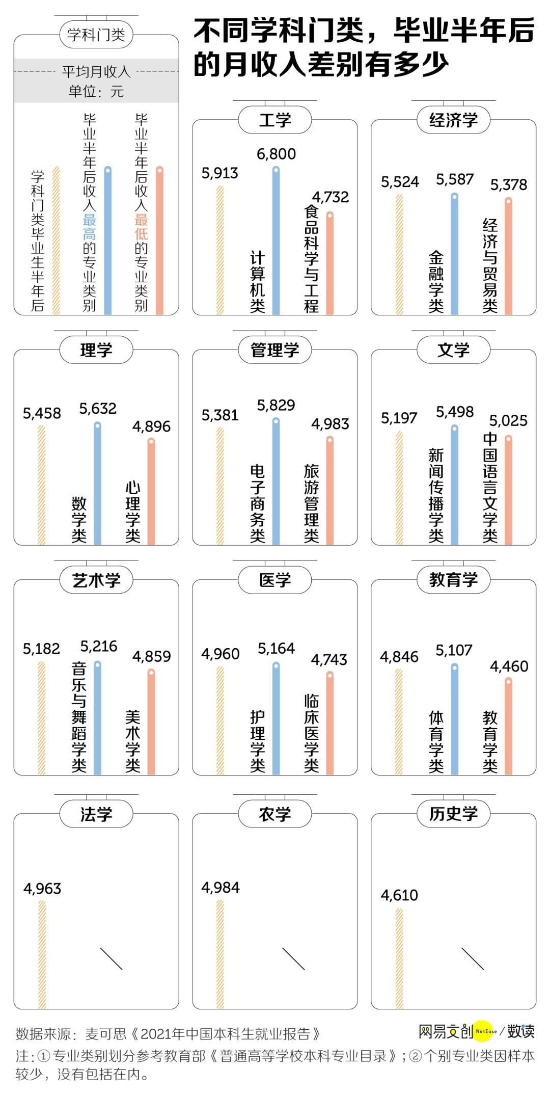 而最低的,则是就业面窄的历史学毕业生,半年后平均月收入比工学低了 28%。教育学、农学门类的薪资也并不高,倒数第二、三,毕业半年后平均月收入分别为 4846 和 4984 元。