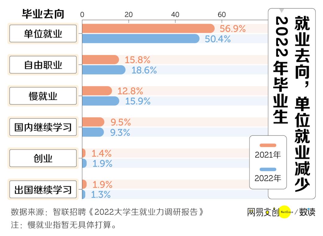 分情况来看,选择到单位就业的毕业生比例下降了 6.5%,而选择自由职业或者慢就业的毕业生分别从去年的 15.8% 与 12.8% 上涨至今年的 18.6% 和 15.9%。
