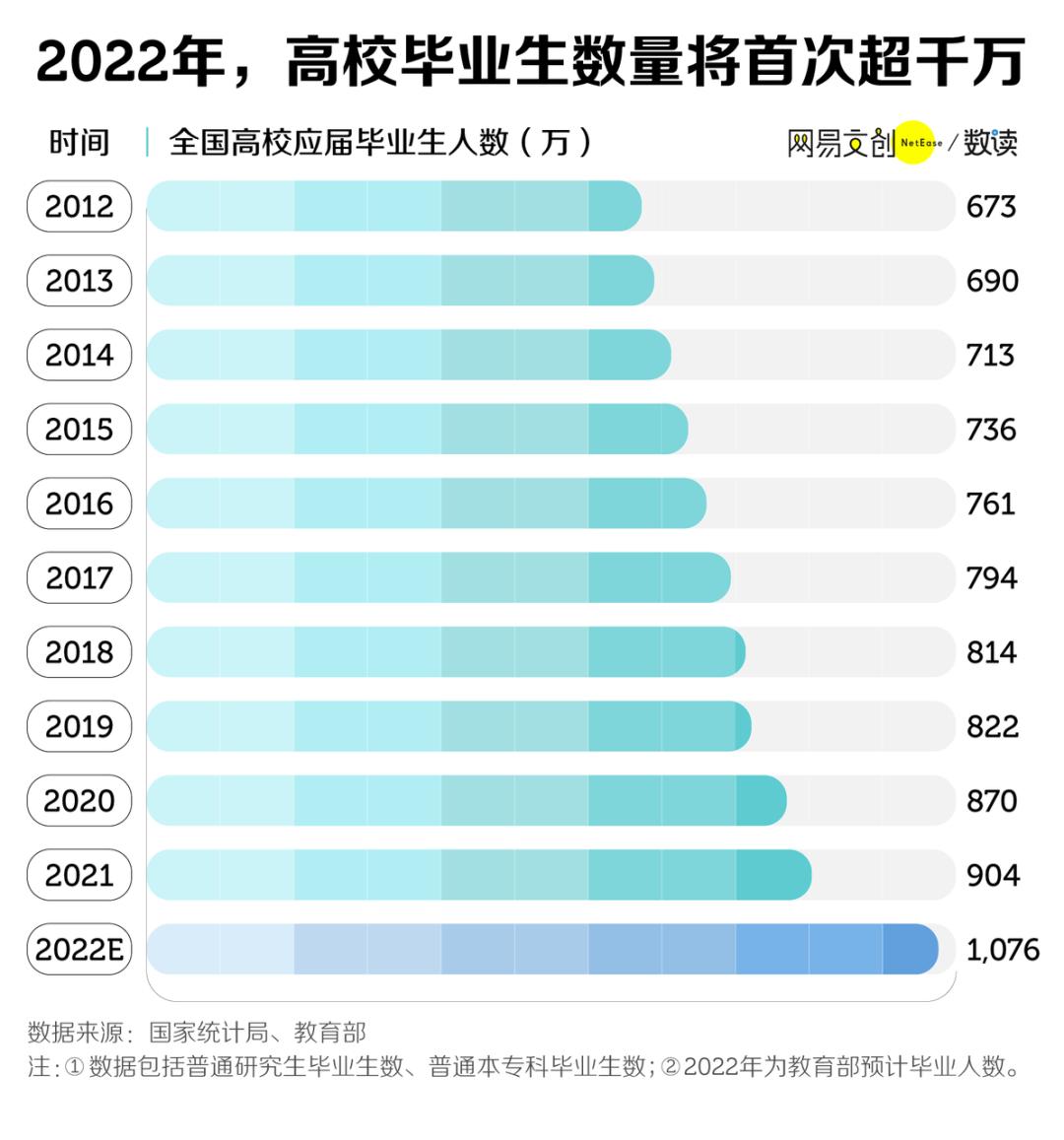 年年毕业人数都是新高,所以每一年都不容易。但在 2022 年,高校应届毕业生人数很可能第一次突破千万大关。