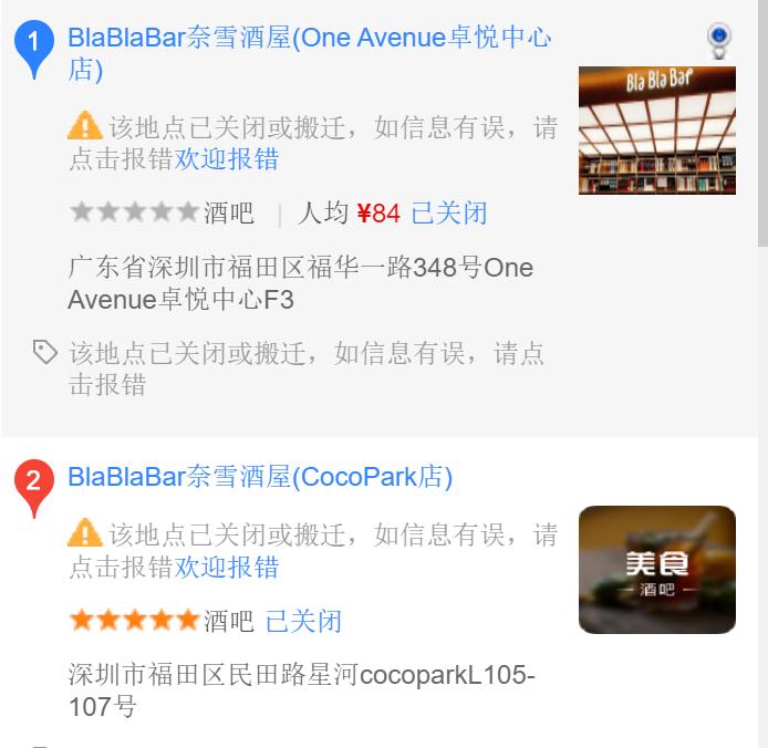 根据百度地图显示,BlaBlaBar奈雪酒屋也已有关门现象,BlaBlaBar奈雪酒屋卓悦中心店和福田星河COCOPARK店均已关闭。