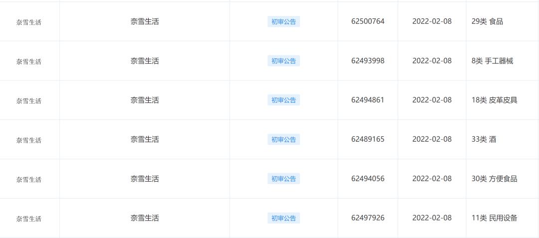值得注意的是,根据企查查显示,今年1月30日和2月8日,奈雪申请了“奈雪生活”21个商标,国际分类涉及广告销售、餐饮住宿、服装鞋帽、酒、食品等,目前这些商标都处于初步审定状态。