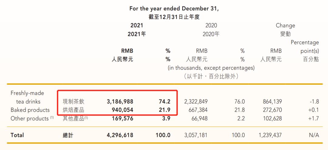 尽管也有布局酒类和咖啡业态,但这两个业态并没有成为奈雪的“第二支柱”,目前茶饮和面包依然是奈雪收入的重要来源。根据奈雪2021年财报显示,现制茶饮和烘焙产品总共占到了总营收的96.1%,其中,现制茶饮占大头,占了74.2%。
