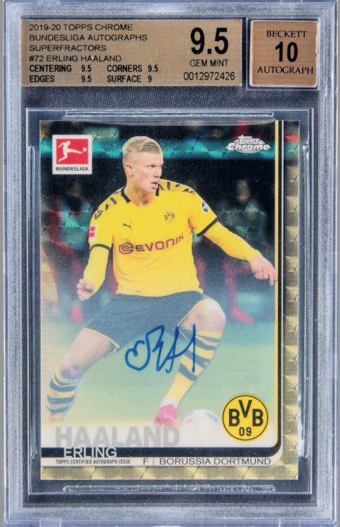 事实上,早在去年欧洲杯期间由Topps出品的2019-20赛季哈兰德「编折签(带编号附签名」球星卡,就在美国知名的戈尔丁拍卖行被拍出了44.3万美元的高价(约合人民币286.57万元)成为了当时历史上成交价格最为昂贵的足球类球星卡。