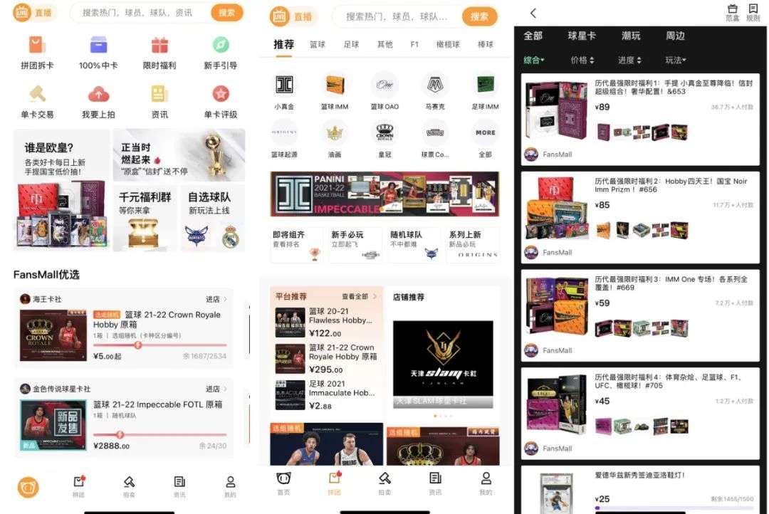 成立于2020年7月的FansMall,在成立之初就切准迅猛发展的集换式卡牌(Trading cards)市场,确定了以IP发行、B2B球星卡销售、FansBox盲盒、FansGo零售、拍卖、评级、直播拆卡等为核心的商业模式,业务涵盖球卡类藏品的贸易生态打造、体育IP全方位品牌推广、潮玩玩家生态平台运营以及媒体优质内容输出,形成了覆盖全产业链的完整闭环。