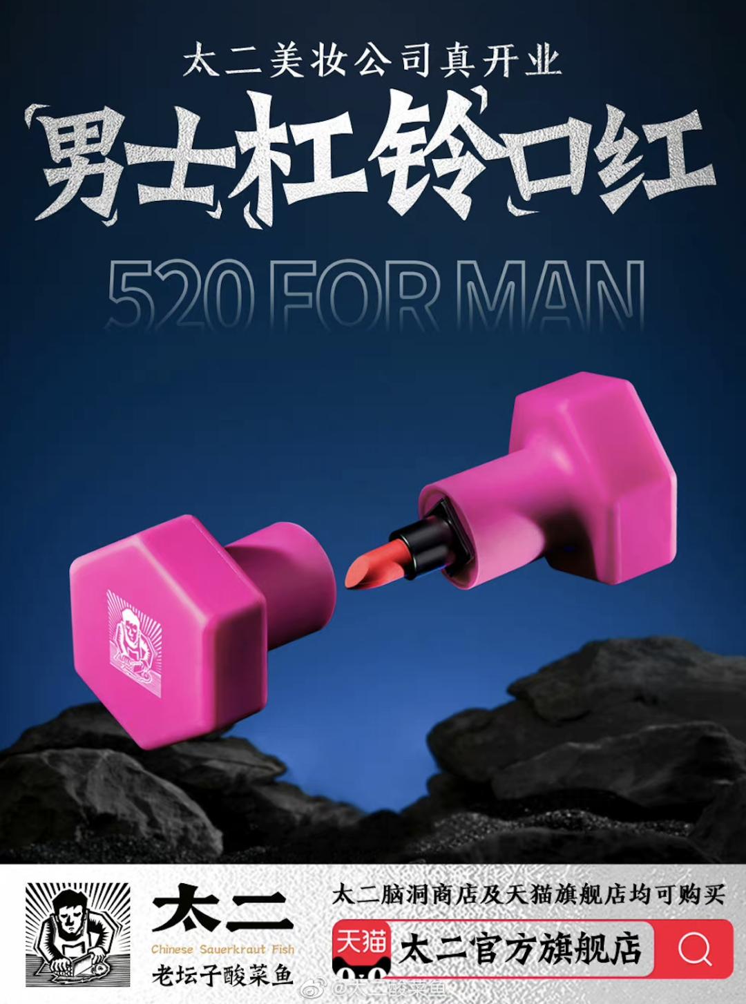餐饮品牌「太二酸菜鱼」跨界推出新奇玩法,开了一家太二美妆公司,上线男士杠铃口红。情侣在 5 月 20 日当天到店吃鱼可以通过密令“我来练练手”发起“抬杠挑战”,成功抬杠 22 次即可获得 1 支男士杠铃口红。除此之外,口红在研发中加入辣椒树脂,上嘴会有轻度辣感,贴合酸菜鱼菜品风味。将生活中的日常抬杠和涂口红的场景融入产品和营销,可以说是一次大胆又奇特的尝试。