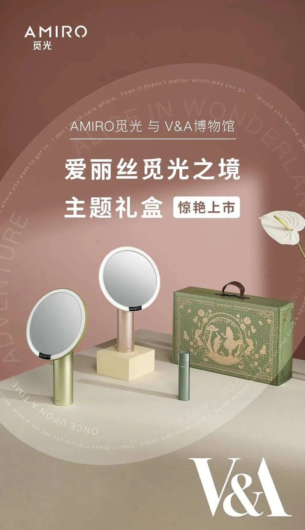 AMIRO觅光与 V&A 博物馆联名,基于经典馆藏主题《爱丽丝梦游仙境》推出镜子礼盒和射频仪礼盒,以“每个女孩都是爱丽丝”的设定,鼓励女孩们在荆棘中绽放,在探索中成长。童话主题的灵感来源构建出一幅艺术花园的梦幻场景,以此打造相匹配设计的产品置于梳妆台。