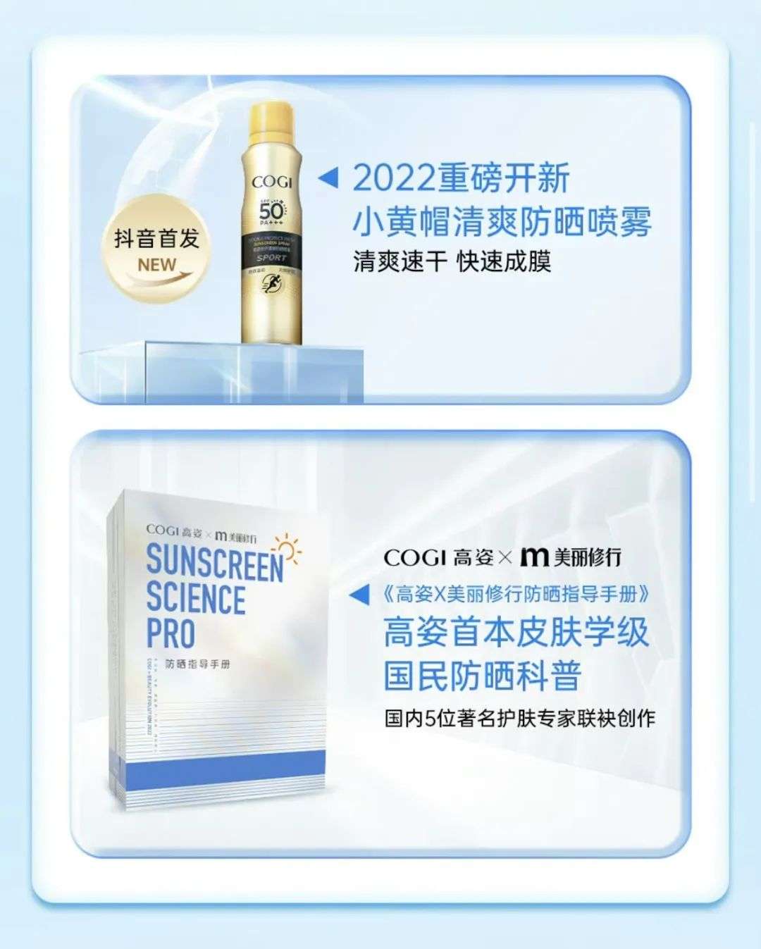 520 前后,高姿不仅邀请新上任的全球防晒代言人王俊凯举办线上见面会,而且还参与了抖音电商开新日活动,发布全新单品小黄帽清爽防晒喷雾,同步发起抖音话题 #520晒我所爱#,目前累计已达 6000w+播放量。此外,高姿还与美丽修行合力打造皮肤学级国民防晒指南《防晒指导手册》,锁定新品爆款防晒,借助抖音平台发力造势。