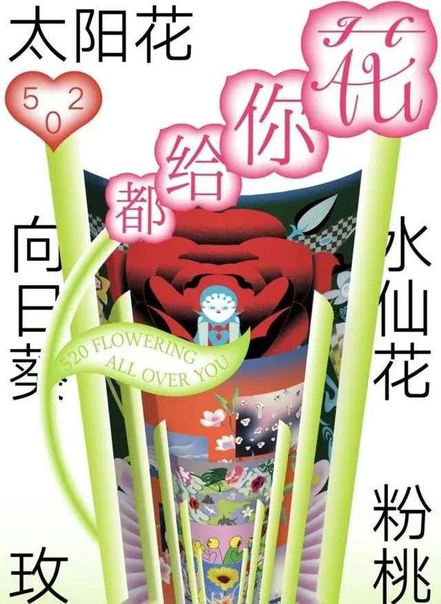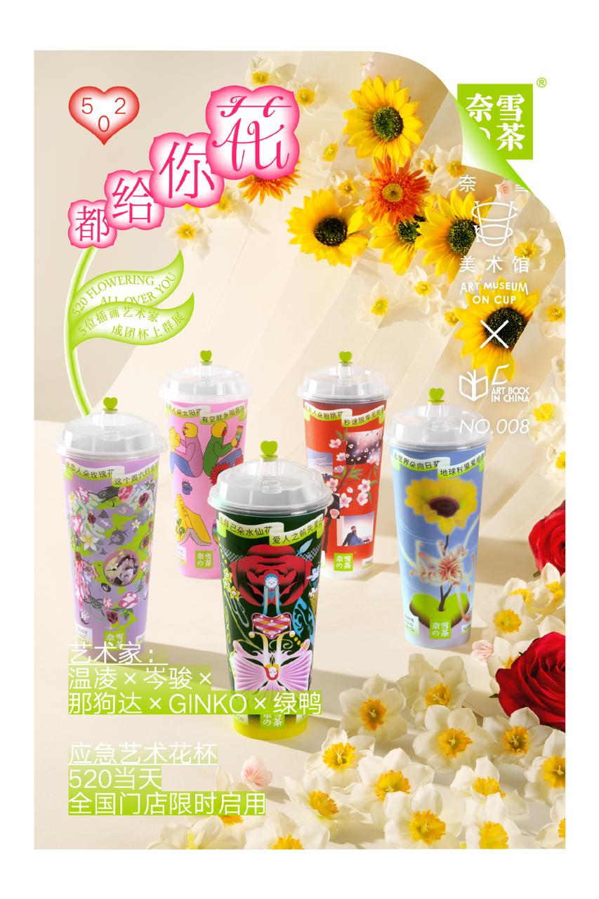 茶饮品牌「奈雪的茶」Cup 美术馆联名 abC 艺术书展,邀请 5 位独立插画艺术家以“花”之名,表“爱”之意,创作出五款应急艺术花杯,策划了一场杯上群展 “都给你花”。