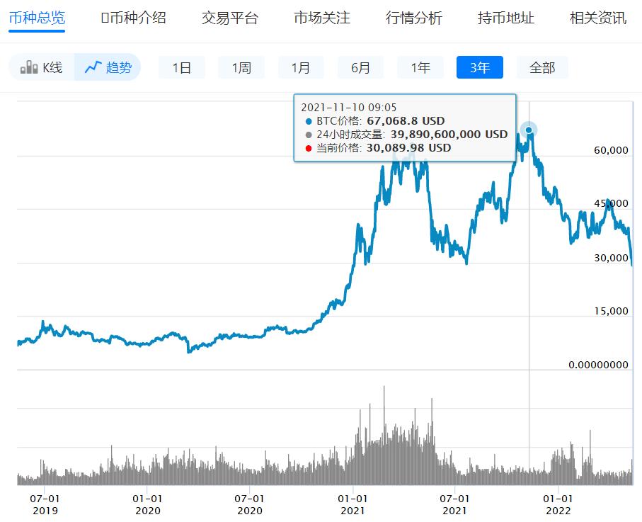 半年前,比特币(BTC)价格一度上涨至6.7万美元/枚以上,半年之后,它的价格已跌破3万美元。不仅仅是比特币,以太坊(ETH)、泰达币(USDT)、币安币(BNB)等众多虚拟货币,最近集体跳水。