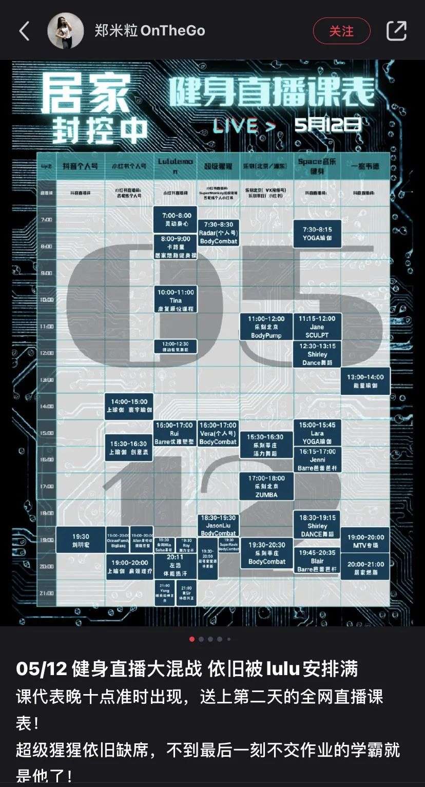 团课教练都“卷起来了”。据一位网友整理,5月12日,超级猩猩的6位教练分别在7:30、12:00、16:00、19:00、19:30、20:00都开了跟练直播,从早到晚排满。一位不愿具名的教练表示,有时候开直播能收到微薄的打赏,也算是居家“失业期”的补贴。
