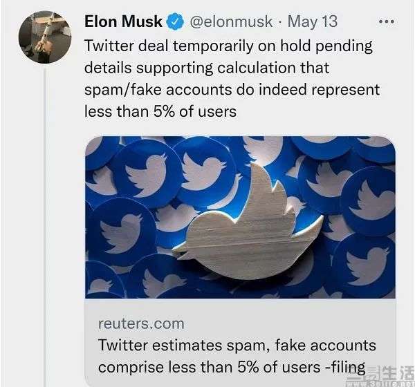 上周五,由于等待有关推特虚假或垃圾信息账号所占比例具体细节的公布,马斯克曾表示,“将暂时搁置收购推特的交易”,直到确保“这一比例在5%以下”。但日前马斯克再次补充到,“推特有20%的虚假及垃圾信息账号,是其宣称的四倍,甚至实际比例还有可能更高”,因此他决定“除非推特证明其虚假账户低于5%,否则交易无法继续推进”。