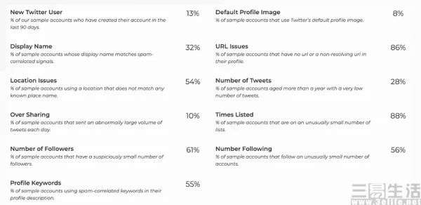 按照SparkToro的定义,虚假或垃圾信息账号是指那些不经常有真人撰写推文、消费平台内容,或是参与生态系统的账户,但其实这一定义也涵盖了许多并不从事黑灰产的机器人账号,比如自动分享黑客新闻网站头版文章的@newsycombinator等。