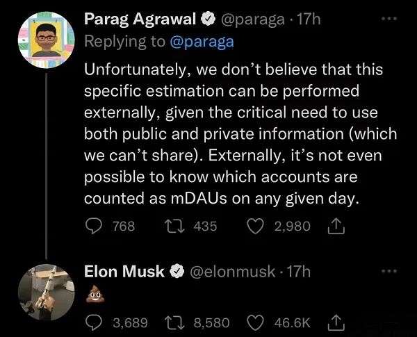所以接下来,马斯克是否会以更低的价格收购推特虽然还无法确认,但推特方面能否拿出让其满意的证据,来证明“推特虚假垃圾账号占比低于5%”,或许主动权还依旧掌握在马斯克的手中。至少从目前看来,对于推特CEO帕拉格·阿格拉瓦尔的解释,马斯克仅仅只用一个“大便”表情来回应。