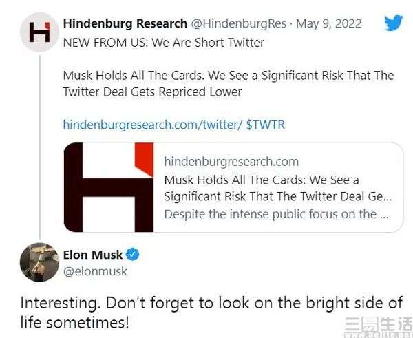 此前,做空机构Hindenburg Research方面曾指出,“埃隆·马斯克收购推特的交易或面临被重新下调定价的重大风险”,并表示这主要是因为马斯克掌握着收购的主动权。但在当时,马斯克回应称,“有趣的很,不要忘记偶尔多看看生活的光明面!”