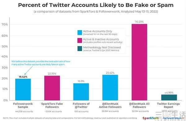 然而为了响应“大众的关切”,也有更专业的分析人员及受众研究软件参与了这项关于推特虚假账号的分析。在5月13日至5月15日,运营检测虚假粉丝工具的SparkToro与Twitter研究工具Followerwonk联手,公布自己的研究结果。