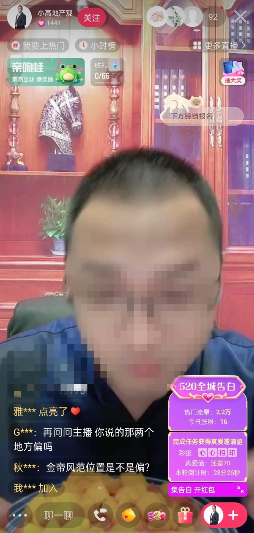 随意点进一个房产直播间,就能听到主播侃侃而谈房源的性价比等信息,回答弹幕提出的疑问,间或叫“老铁们”加粉丝团并引流微信,宣传线下组织的团购活动,并且告诉观众,联系主播线下看房会比售楼处优惠,还有专车接送等服务。