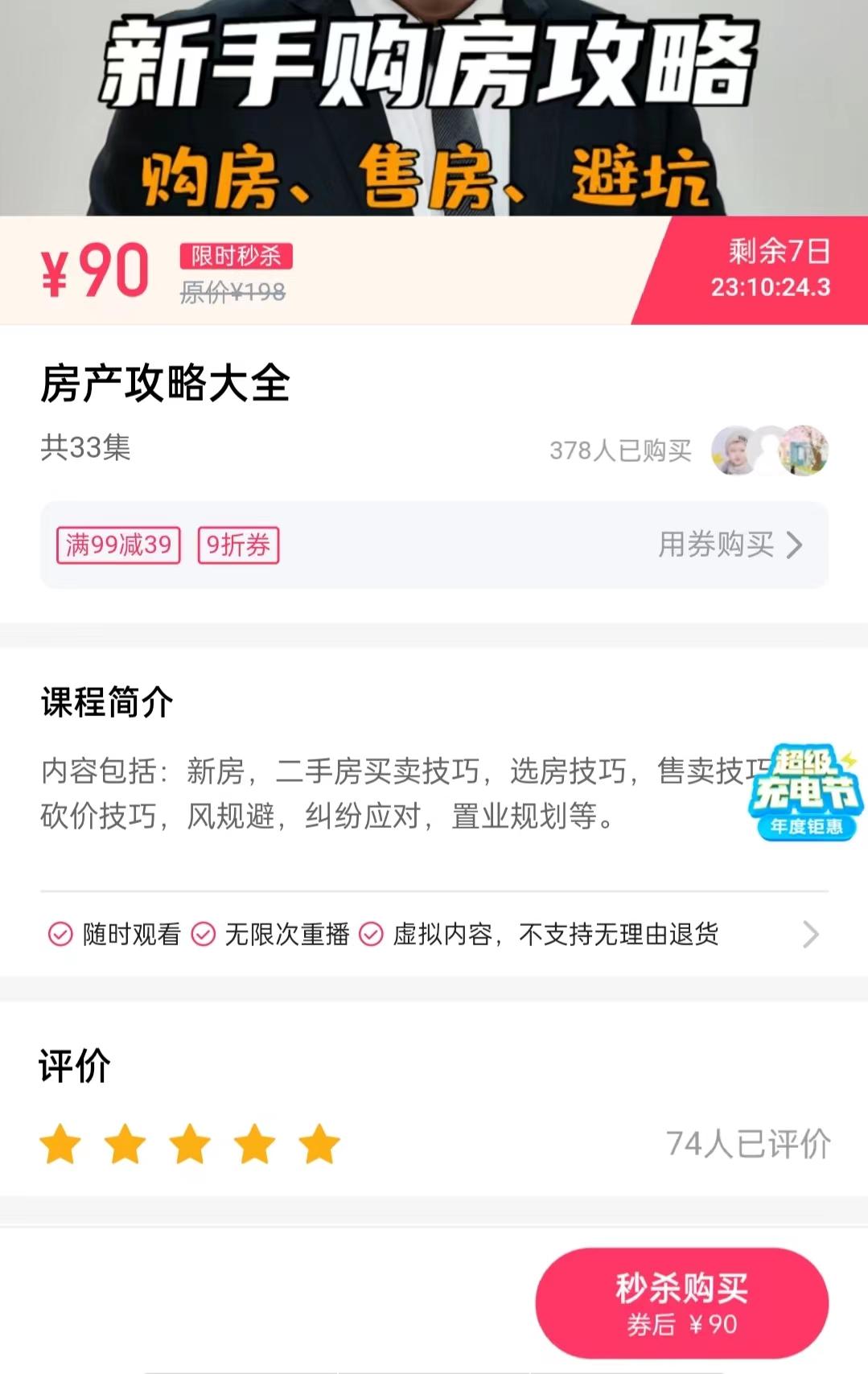 在房产领域,有人选择以直播卖课形式变现。以130万粉的房产领域创作者小北说房为例,其在快手卖的定价百元的短视频课程,一共包含33个视频,大部分视频不超过五分钟。截至5月19日,有将近400人购买了该课程。