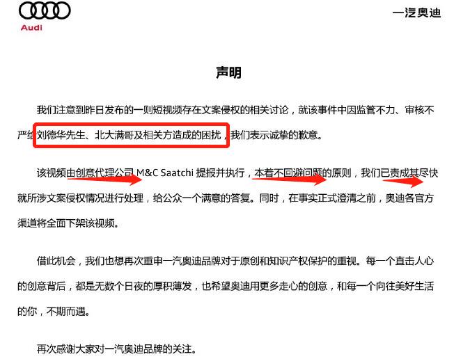 此外,奥迪《声明》在论资排辈上也讲究了良好的江湖素养,将刘德华先生放在了北大满哥之前,并对各方表达了“诚挚的歉意”。毕竟刘德华虽然可能合计(大概)拿了几百万的收益,但江湖地位高,那辛苦自是无法用钱计量的。