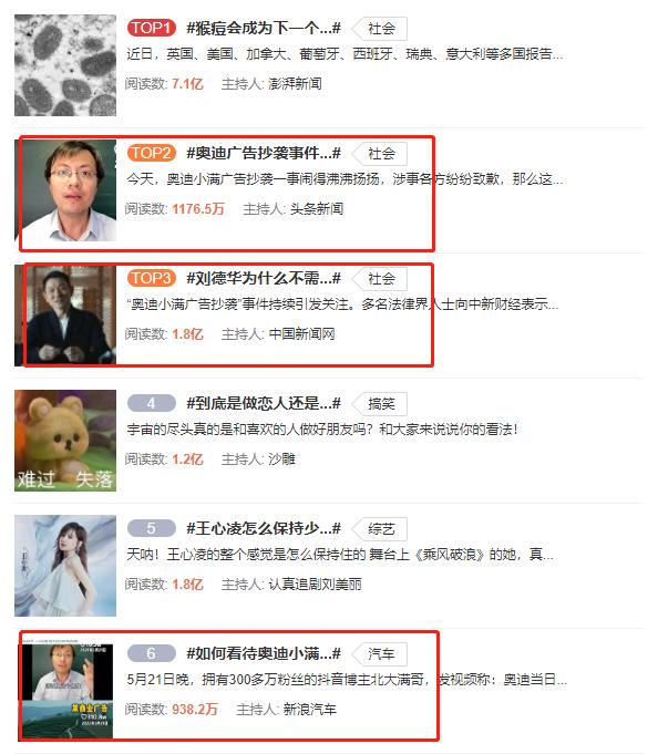 几个小时的时间内,奥迪刘德华视频抄袭事件,就以各种关键词的形式,霸榜了各大信息平台的热搜。