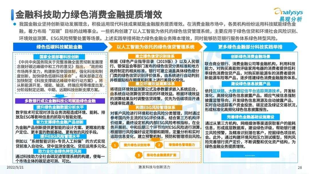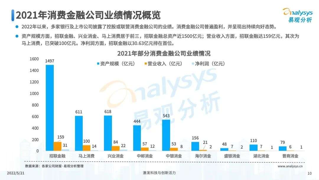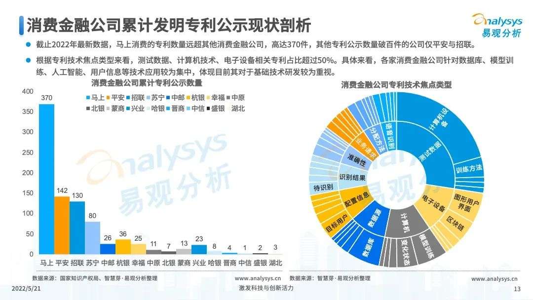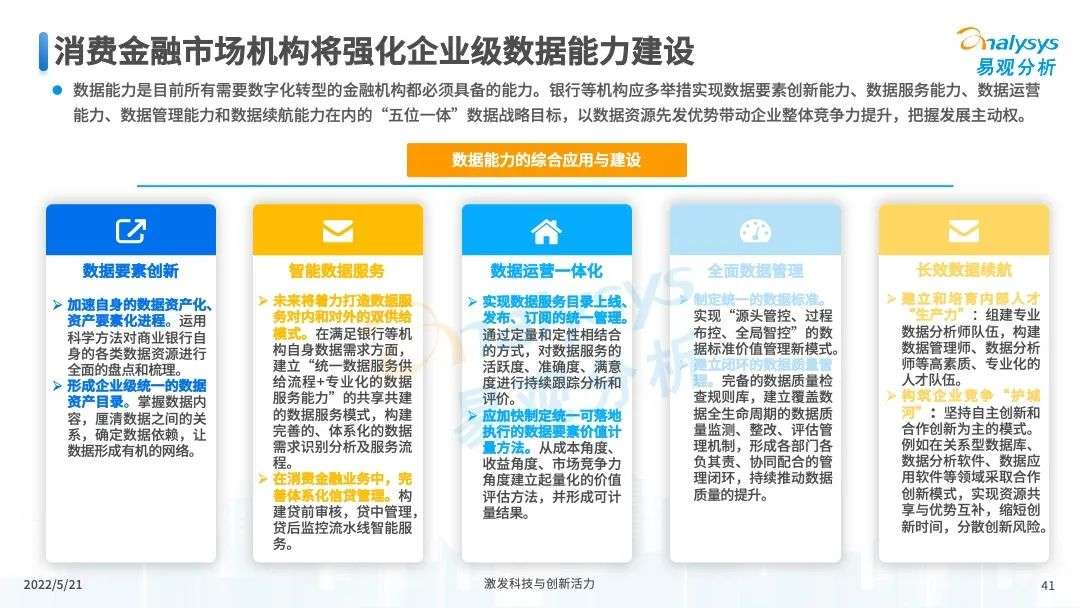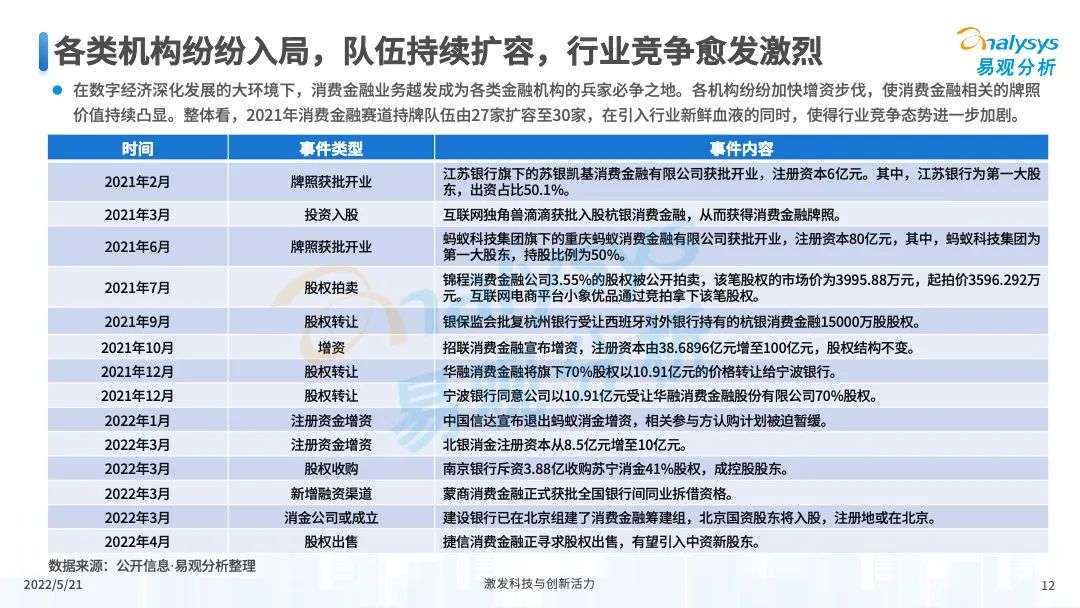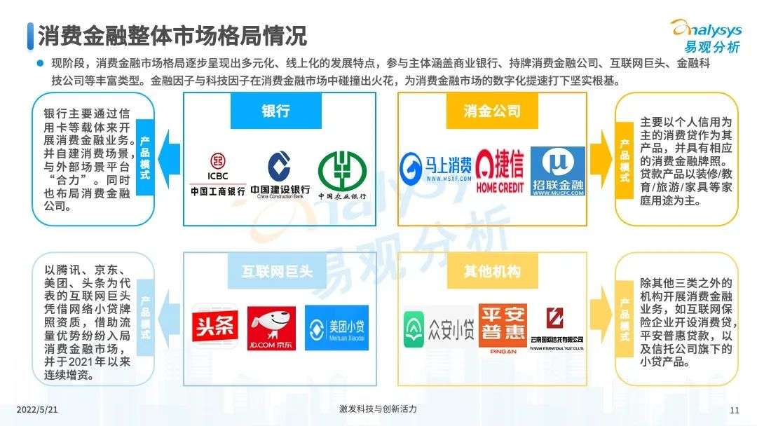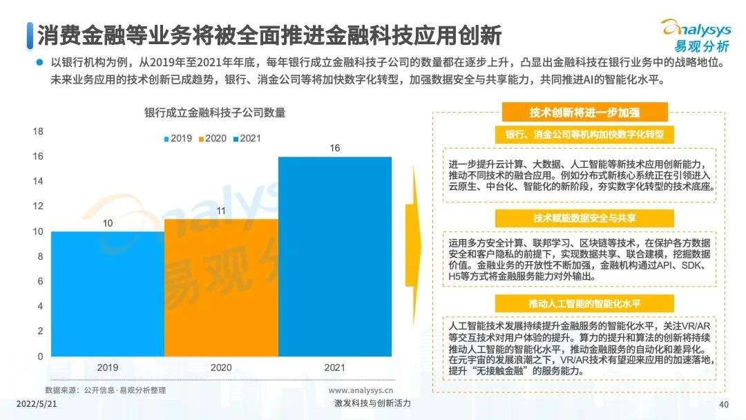 2022年初,国家发布《金融科技规划(2022-2025)》,企业数字化转型进展加快。回顾2021年,居民消费结构升级,线上化趋势突显,消费金融市场机构积极建设自身数字化业务能力。各家消费金融机构增加技术专利申请,银行机构加大科技投入,围绕自身各类科技实力建设已经逐步进行,并且加强绿色金融理念构建全面数字化业务场景。未来将进一步推进消费金融市场科技创新,提升赋能数字化进展。