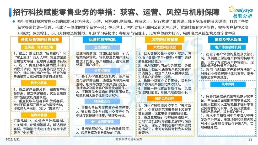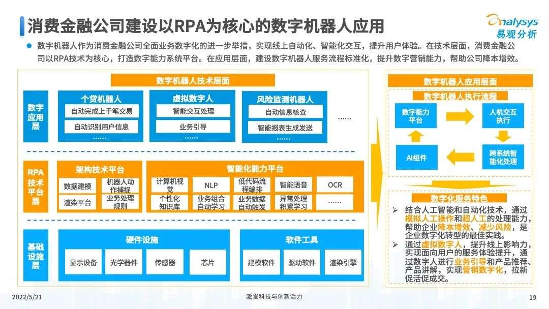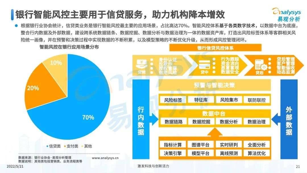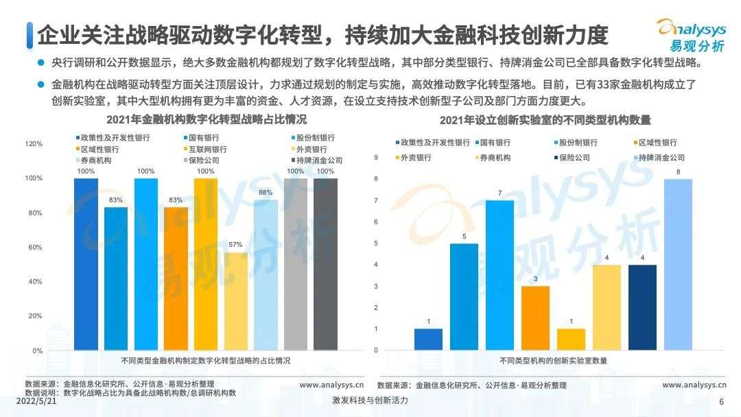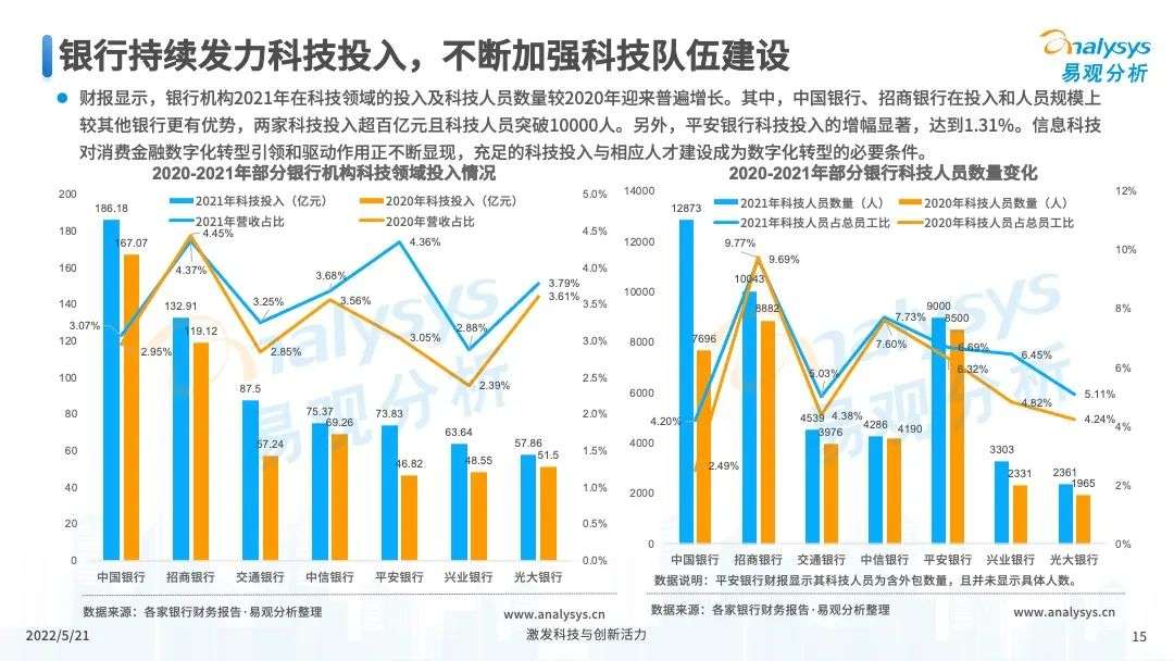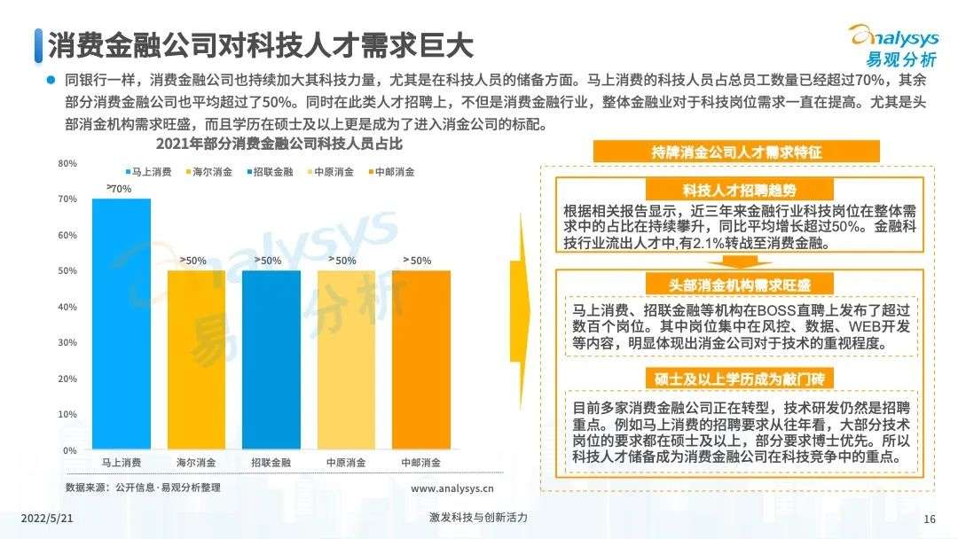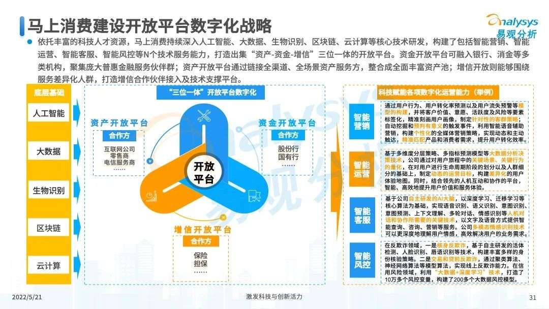 2022年初,国家发布《金融科技规划(2022-2025)》,企业数字化转型进展加快。回顾2021年,居民消费结构升级,线上化趋势突显,消费金融市场机构积极建设自身数字化业务能力。各家消费金融机构增加技术专利申请,银行机构加大科技投入,围绕自身各类科技实力建设已经逐步进行,并且加强绿色金融理念构建全面数字化业务场景。未来将进一步推进消费金融市场科技创新,提升赋能数字化进展。