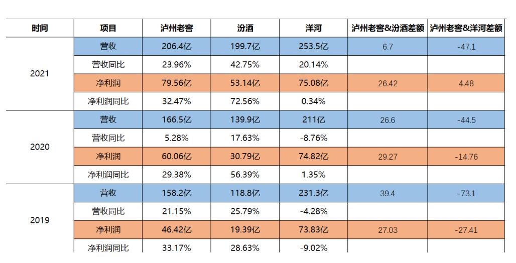 然而到了2021年,随着洋河恢复增长,这一趋势发生变化。根据2021年年报,泸州老窖营收206.4亿元,洋河股份为253.5亿元。二者的差额再次扩大到47.1亿元。